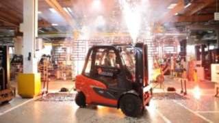 Mit Verlassen des letzten Montagebandabschnitts startete ein schillerndes Indoor-Feuerwerk und markierte die Fertigstellung des millionsten Gegengewichtsstaplers von Linde Material Handling im Werk Aschaffenburg.